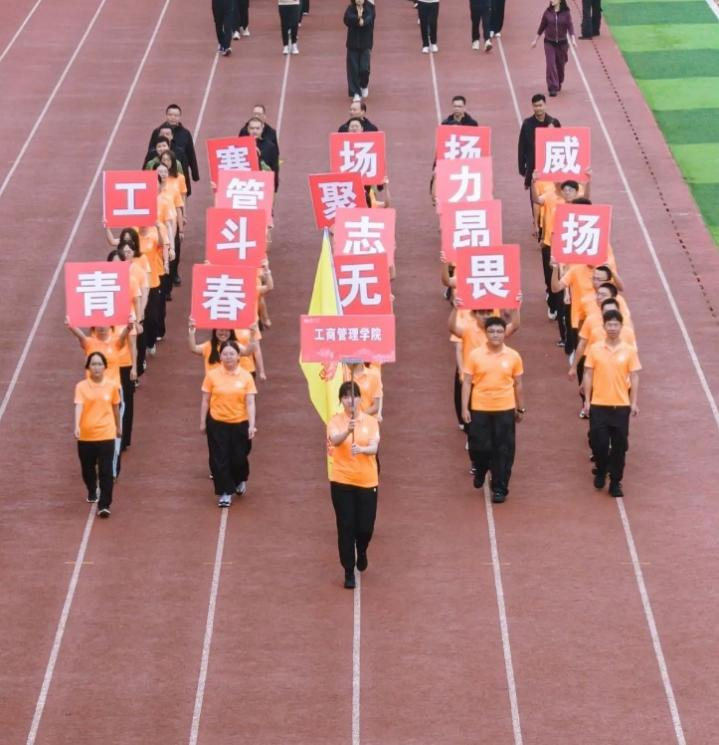 湖南大学运动场上赛前展演落下帷幕,各方阵入场环节燃情开启。工商管理学院队伍身着橙色院服,迈着整齐步伐前进,行至主席台前,队员们高举院牌齐声呐喊:“青春无畏,斗志昂扬!工管聚力,赛场扬威!”口号响彻赛场。待所有方阵集结完毕,一同开启健身跑环节,绕场两周,流动的队伍如多彩浪潮,将气氛推至高潮,第25届校运会正式拉开序幕。