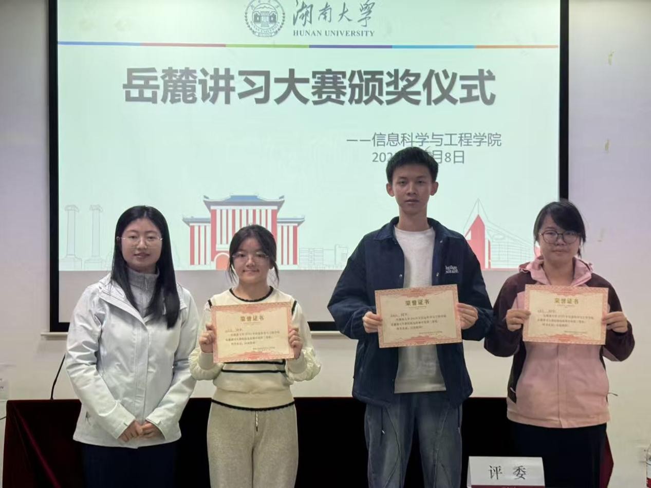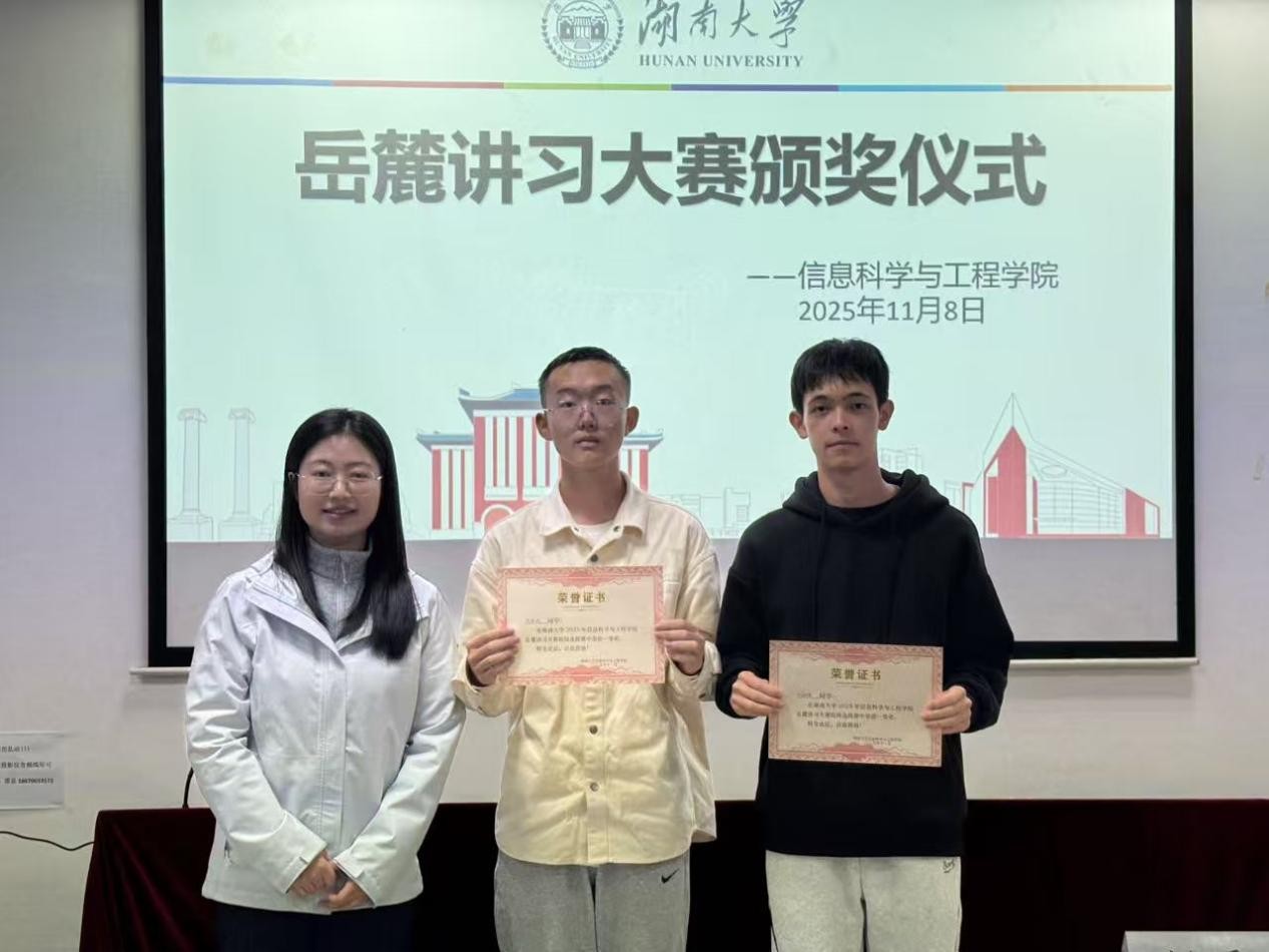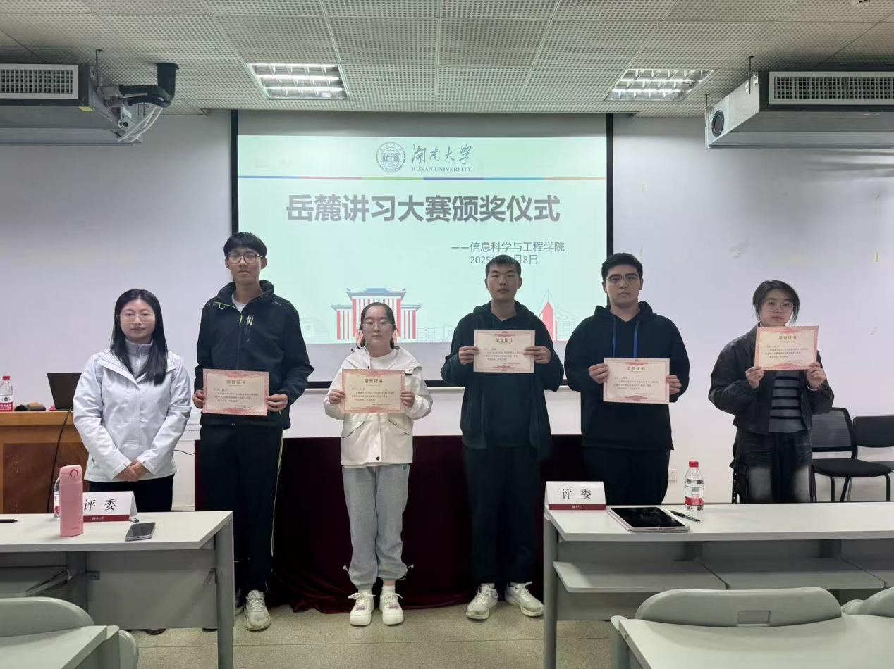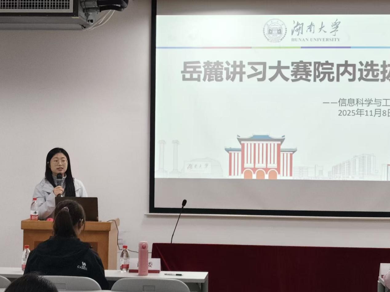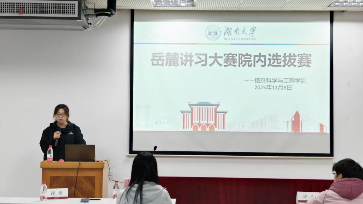 2025年11月8日,信息科学与工程学院主办的"岳麓讲习大赛院内选拔赛"在岳麓书院精神的浸润中成功举行。十位选手围绕书院物质文化与精神传承,展开了一场跨越千年的青春对话。整场活动分为两个主要环节:参赛选手依次登台讲解,展现他们对书院精神的深刻理解;随后是徐婧童老师的精彩总结和许博妍同学的经验分享,最后举行隆重的颁奖仪式。现场气氛庄重而热烈,学子们通过PPT讲解、影像展示、情感演绎等多种形式,将书院楹联、牌匾、碑刻、建筑中蕴含的智慧与当代青年的使命紧密结合,充分展现了信科学子对传统文化的深刻理解与创新传承。