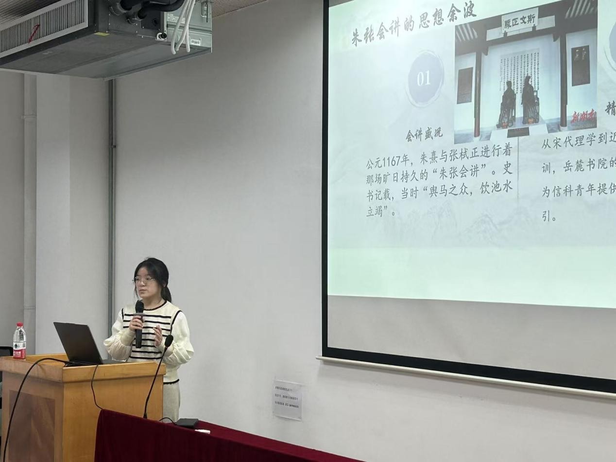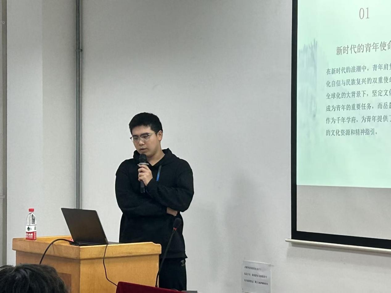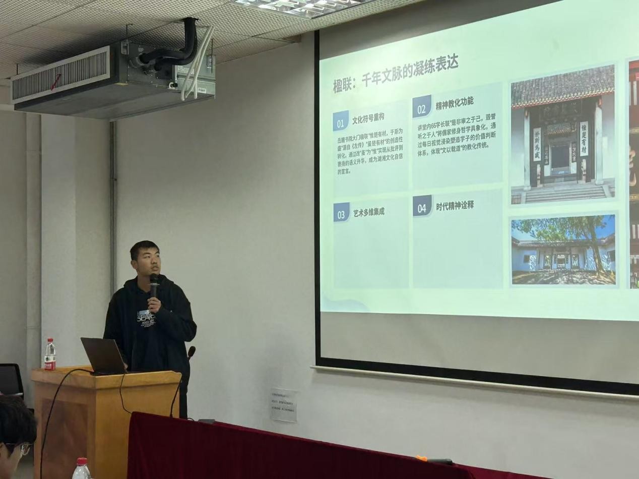 沈程诚同学以"物质文化载体与青年成长"为主线,系统梳理了楹联、牌匾、碑刻、建筑四大文化载体的育人功能。通过分析"惟楚有材,于斯为盛"楹联的精神内涵、"道南正脉"牌匾的文化自信、学规碑刻的修身准则以及讲堂建筑的空间教育意义,他构建了一个完整的书院精神传承体系。他强调,当代青年应当成为书院精神的"讲解员"与"创新者",在深入理解传统智慧的基础上,结合专业特长,为文化传承开辟新的路径。