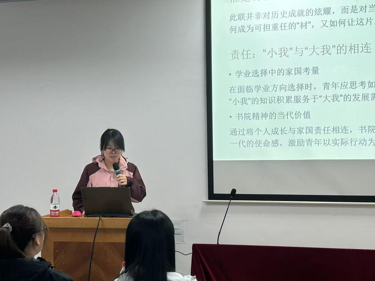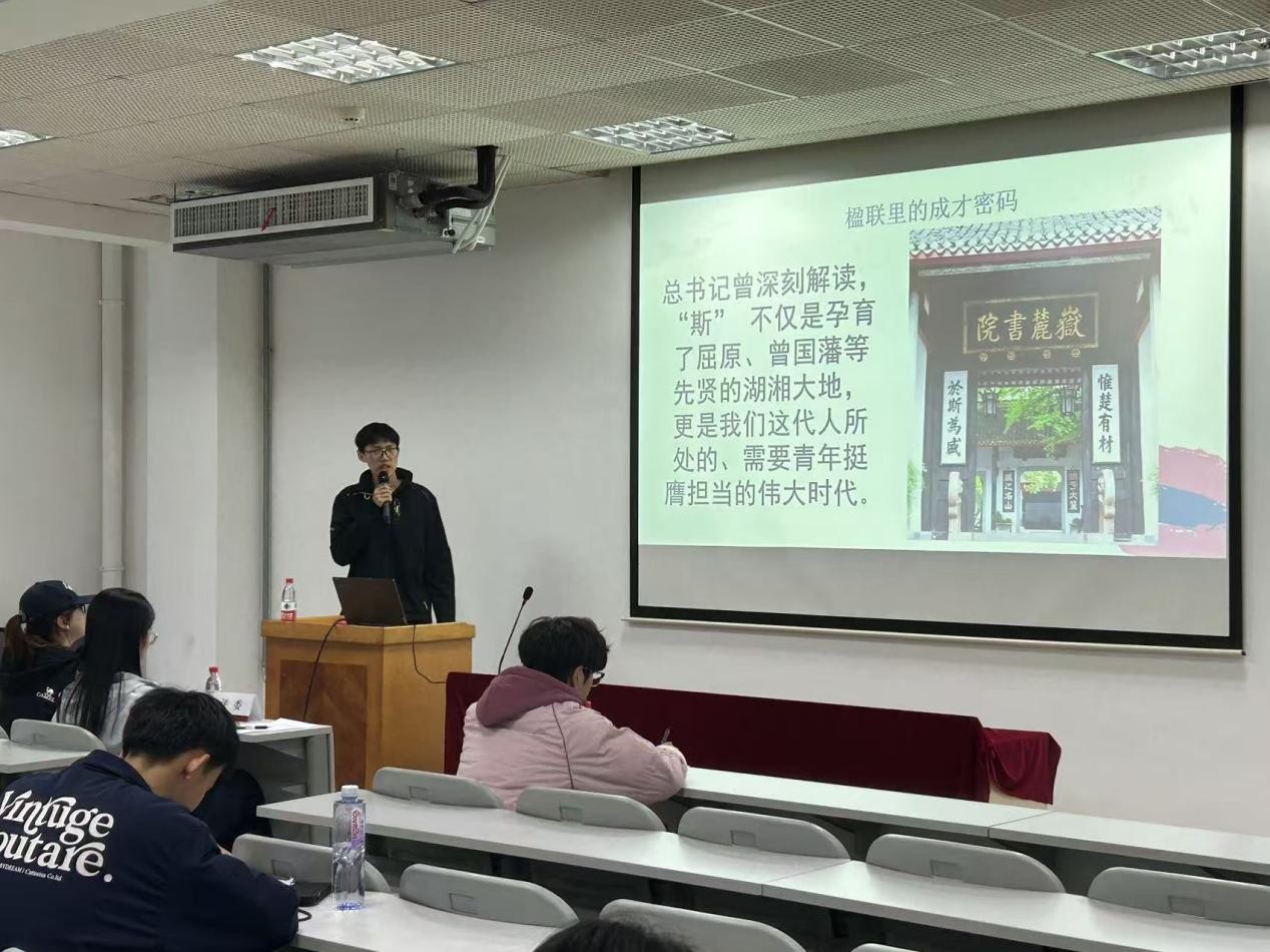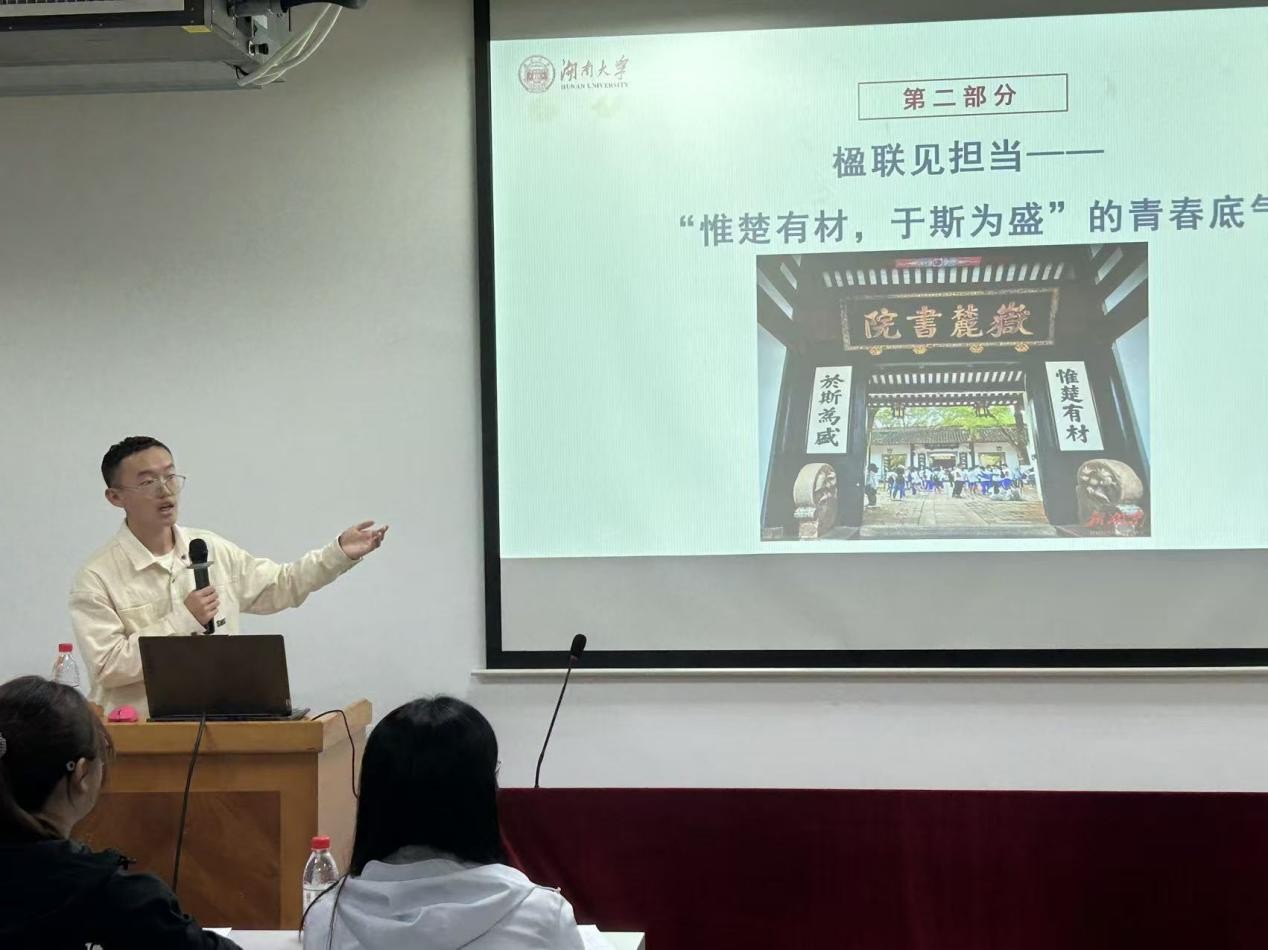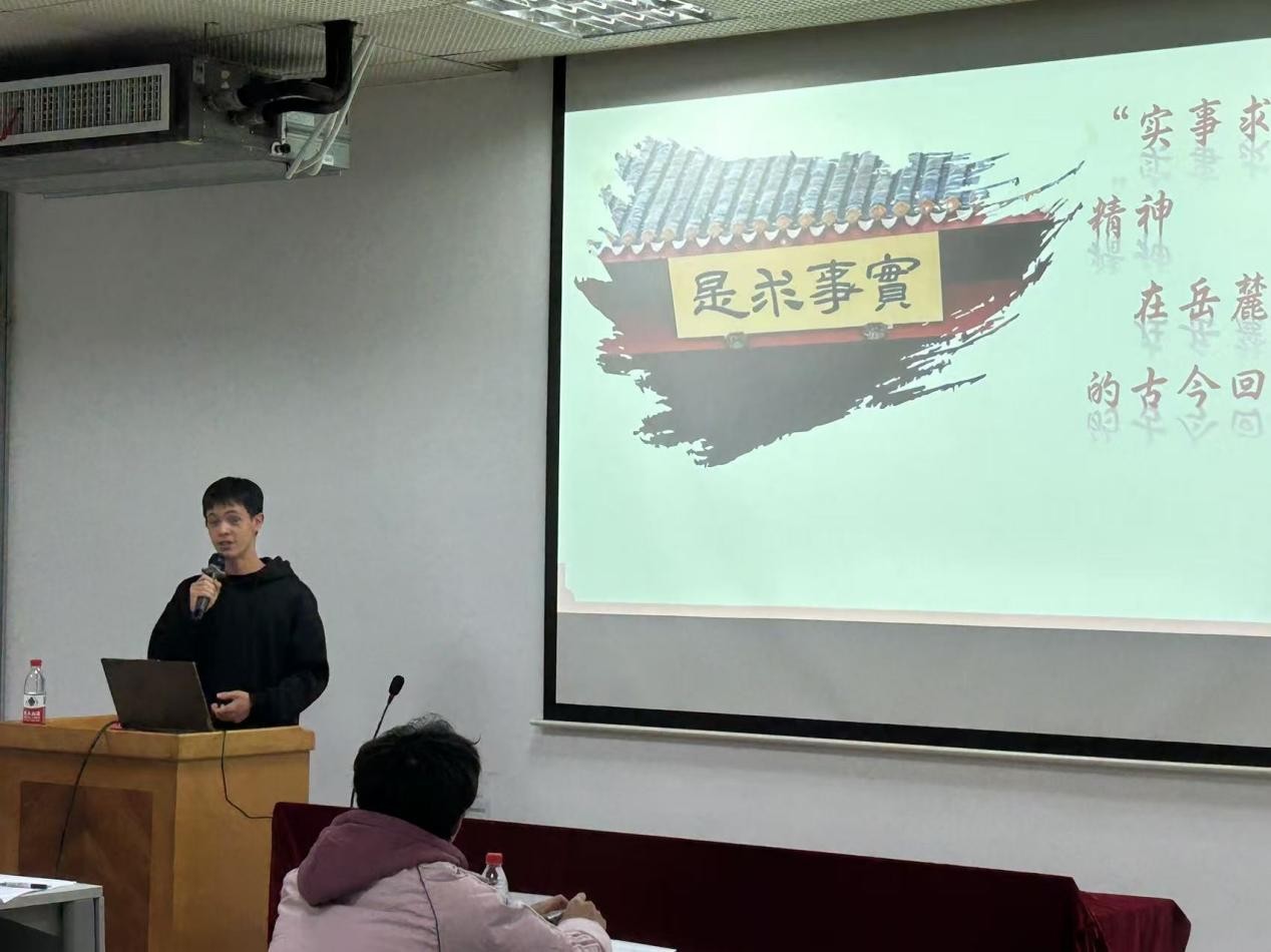 沈程诚同学以"物质文化载体与青年成长"为主线,系统梳理了楹联、牌匾、碑刻、建筑四大文化载体的育人功能。通过分析"惟楚有材,于斯为盛"楹联的精神内涵、"道南正脉"牌匾的文化自信、学规碑刻的修身准则以及讲堂建筑的空间教育意义,他构建了一个完整的书院精神传承体系。他强调,当代青年应当成为书院精神的"讲解员"与"创新者",在深入理解传统智慧的基础上,结合专业特长,为文化传承开辟新的路径。